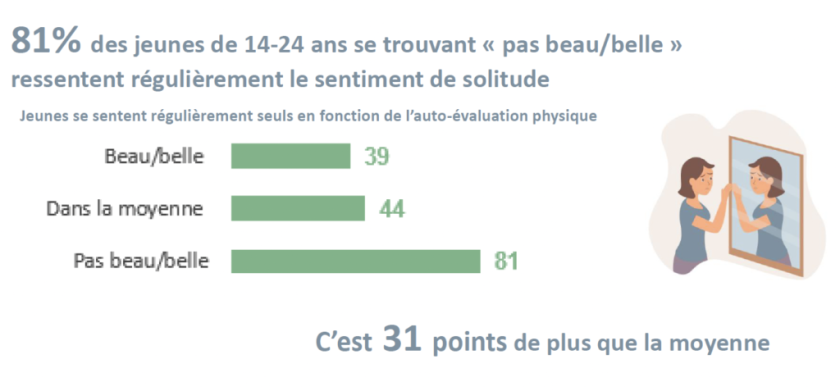 « pas beau/belle » indiquent être stressés, contre 68% en moyenne. De même, 81% des jeunes de 14-24 ans ne se trouvant « pas beau/belle » ressentent régulièrement le sentiment de solitude.