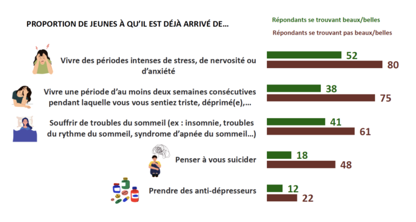 Enfin, si de multiples facteurs ont une influence sur la santé mentale, l’enquête a le mérite pour la première fois de montrer à quel point le point de vue négatif des jeunes sur leur vie et sur la société peut être notamment déterminé par leur faible estime de soi sur plan physico-esthétique.