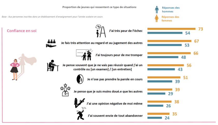 Autre principal enseignant de l’enquête, un profond « gender gap » apparaît dans les problèmes de santé mentale et de confiance en soi des jeunes : les symptômes anxieux et dépressifs et autres idées suicidaires étant notamment beaucoup plus répandus chez les jeunes filles.