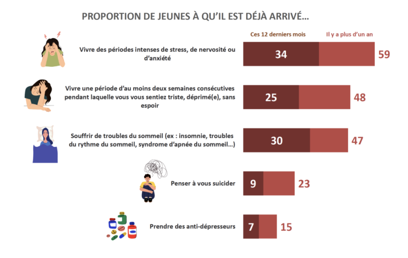 L’étude montre à quel point les troubles psychiques – signalés par de nombreux rapports post-confinements – atteignent des niveaux de prévalence alarmants chez des jeunes qui admettent massivement être l’objet de symptômes anxieux, dépressifs voire suicidaires.