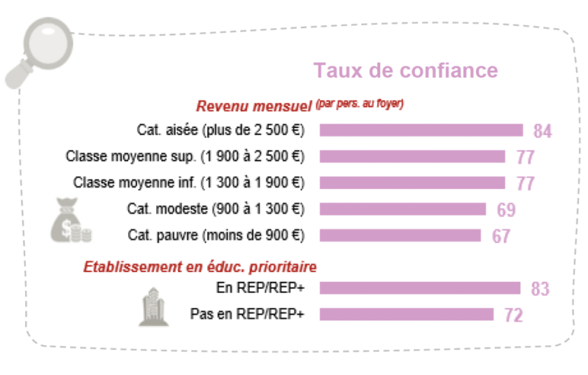 L’auto-dépréciation de son niveau scolaire affecte en effet deux fois plus les élèves des milieux les plus modestes (33% des élèves appartenant aux foyers de revenus inférieurs à 900 € nets/mois par individu) que ceux des milieux les plus aisés (16% des élèves appartenant aux foyers de revenus supérieurs à 2500 € nets/mois par individu). Plus d’un tiers des filles (34%) contre moins d’un quart des garçons (23%) indiquent ne pas avoir confiance en leur niveau scolaire, cette proportion montant même à 38% chez les jeunes filles homo, bi ou pansexuelle.