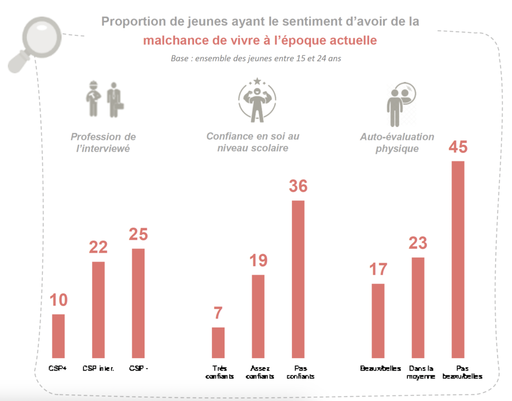 Le point de vue de François Kraus (IFOP) : « Le désenchantement adolescent à l’égard du monde et de la société est loin d’être une nouveauté si l’on en juge par la perspective historique donnée par cette enquête. En réalité, l’adolescence et la post-adolescence sont une phase de la vie ou s’exacerbe « toutes les vulnérabilités » à un âge où les jeunes sont soumis à des chamboulements physiques et physiologiques lourds mais aussi à des de expériences parfois violentes. Attisé par les excès d’idéalisme habituellement observé à un âge ou l’adolescent peine à trouver sa place dans l’environnement qui l’entoure, ce rapport quelque peu désabusé à la société apparaît plutôt une constante sociologique dont la récurrence donne à penser qu’il est davantage le fruit d’un « effet d’âge » que d’un « effet de génération ».