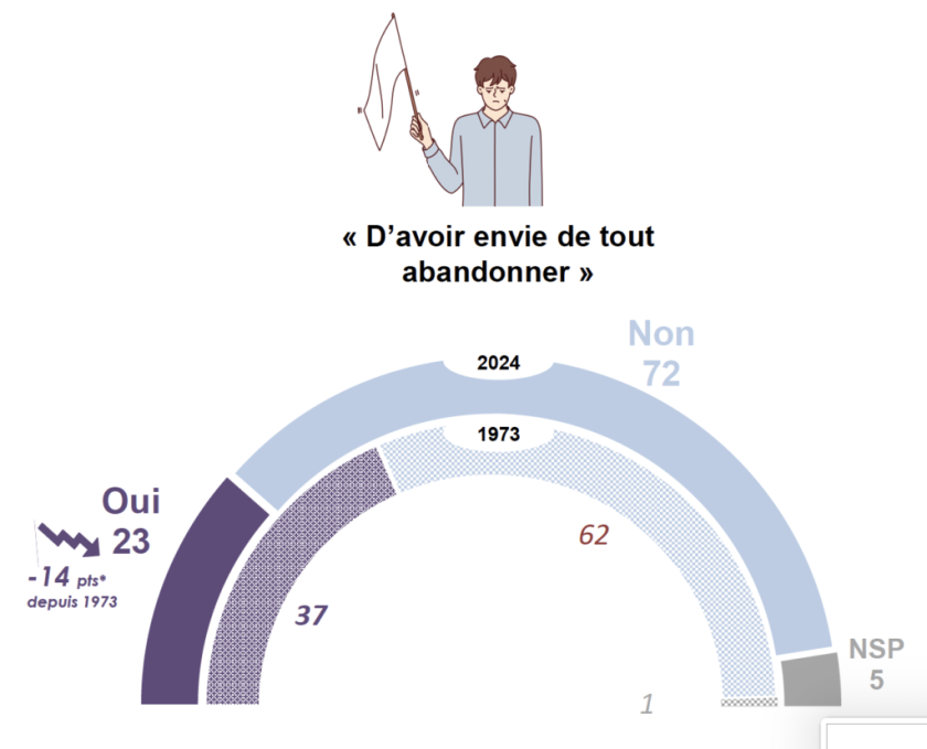 3 – Alimenté par les crises (sanitaires, environnementales…) qui pèsent sur les esprits, le ressentiment d’une partie des jeunes à l’égard du monde qui les entourent n’en fait pas pour autant une génération fataliste. Au contraire, la tentation de baisser les bras et de tout abandonner affecte en 2024 à peine plus d’un quart des jeunes âgés de 14 à 15 ans (23 %), contre plus d’un tiers il y a une cinquantaine d’années (37 % en 1973).
