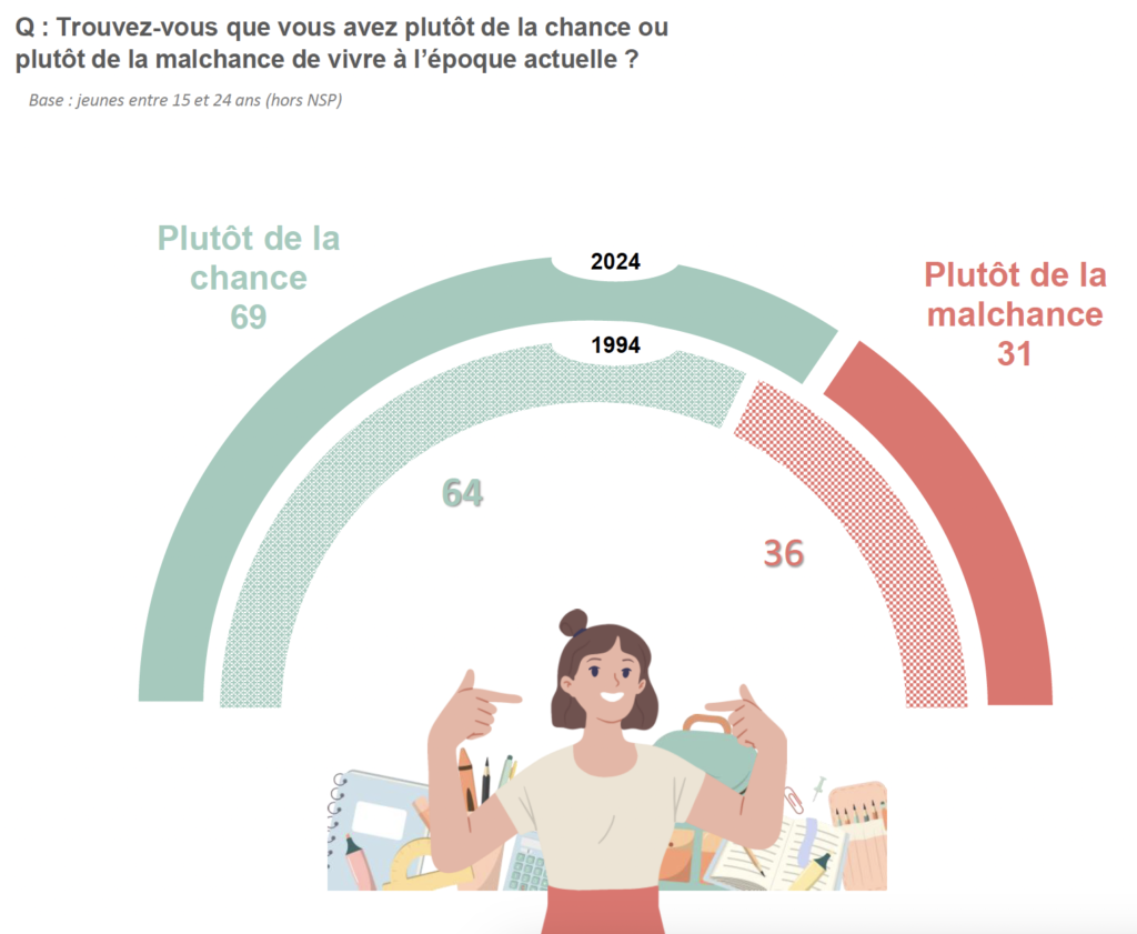 1 – Le pessimisme quant aux opportunités qui s’offrent aux jeunes pour s’intégrer dans la société affecte une minorité d’entre eux, minorité d’ailleurs moins forte aujourd’hui qu’il y a trente ans : un jeune sur trois âgé de 15 à 24 ans (31%) a le sentiment d’avoir de la « malchance de vivre à l’époque actuelle », soit une proportion semblable à celle mesurée dans cette tranche d’âge il y a trente ans (36% en 1994).