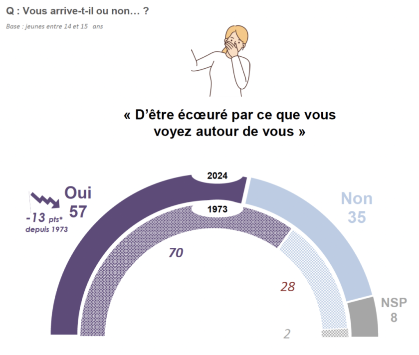 2 – Le désenchantement à l’égard du monde est, lui, plus répandu chez les jeunes sans être pour autant plus élevé que celui observé chez leurs aînés il y a une cinquantaine d’années : 57% des adolescents de 14 à 15 ans se disent aujourd’hui « écœurés par ce qu’ils voient autour d’eux », soit nettement moins qu’il y a 50 ans (70% en 1973) dans un contexte post-soixante-huitard où, il faut le rappeler, la tendance dominante dans la jeunesse était beaucoup plus à la contestation.