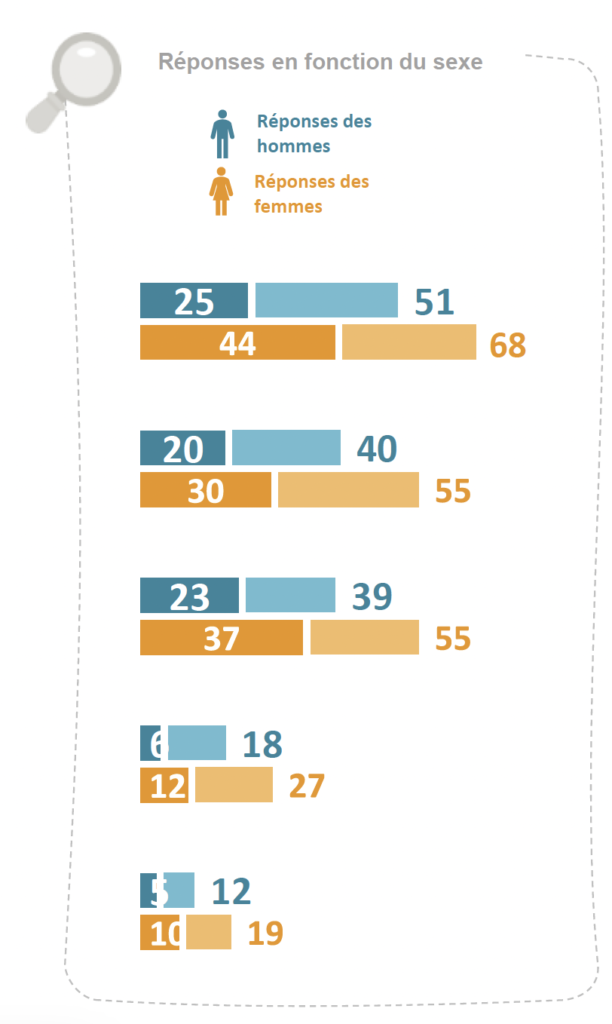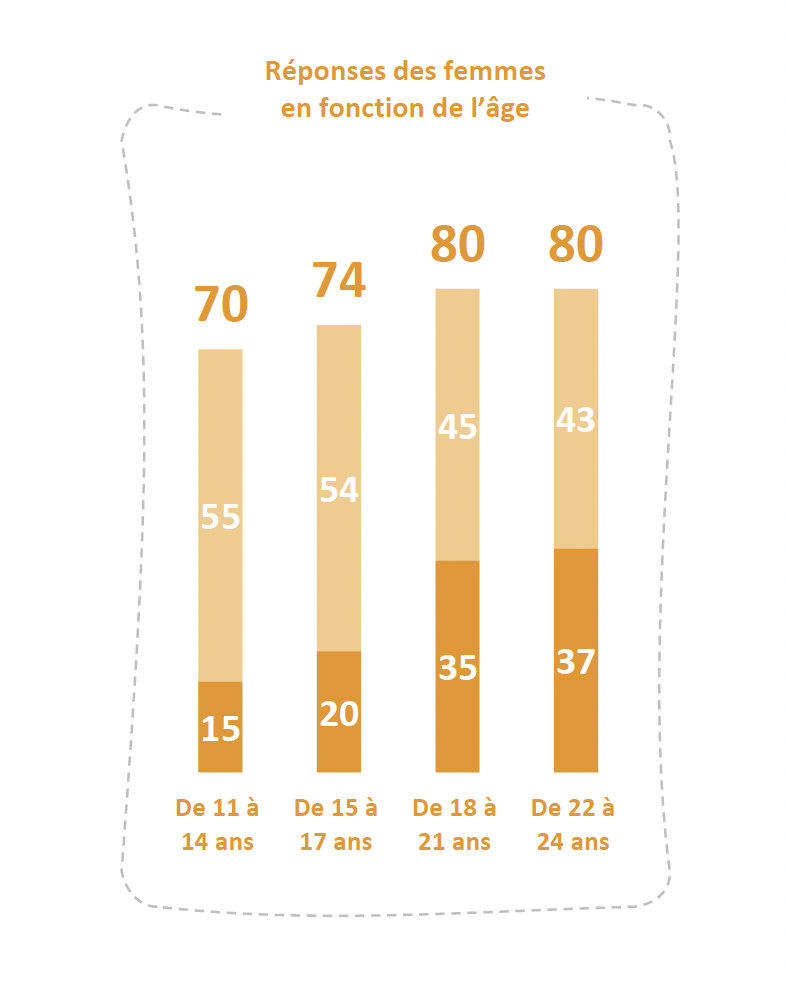 10 – On observe dans la gent féminine de cet âge des troubles psychiques juvéniles nettement plus répandus que dans la gent masculine tels que des troubles anxieux (68%, contre 51% chez les hommes), des états dépressifs (55%, contre 40% des hommes) ou des pensées suicidaires (27%, contre 18% des hommes).